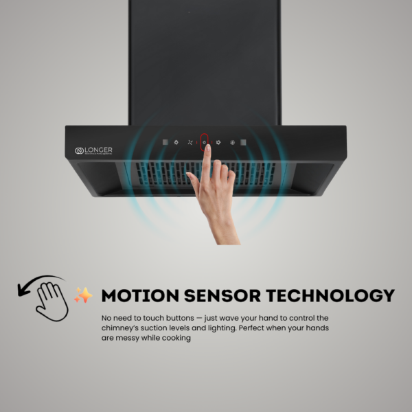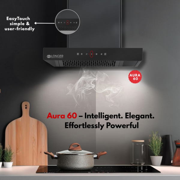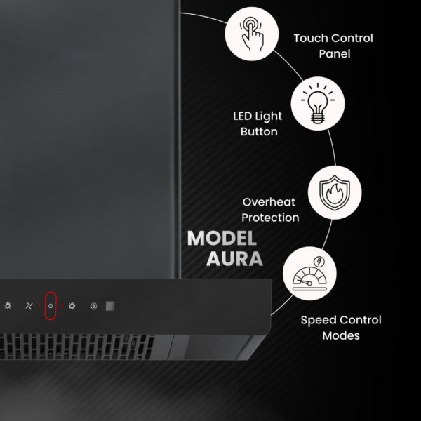 The Aura Chimney is 90 cm crafted to deliver powerful suction with silent performance, making everyday cooking cleaner and more comfortable. Equipped with Filterless technology, Super Hush Suction, and motion sensor touch control, it efficiently removes smoke and odors while maintaining a sleek, modern black finish. Designed for contemporary kitchens, Aura combines performance, elegance, and reliability.